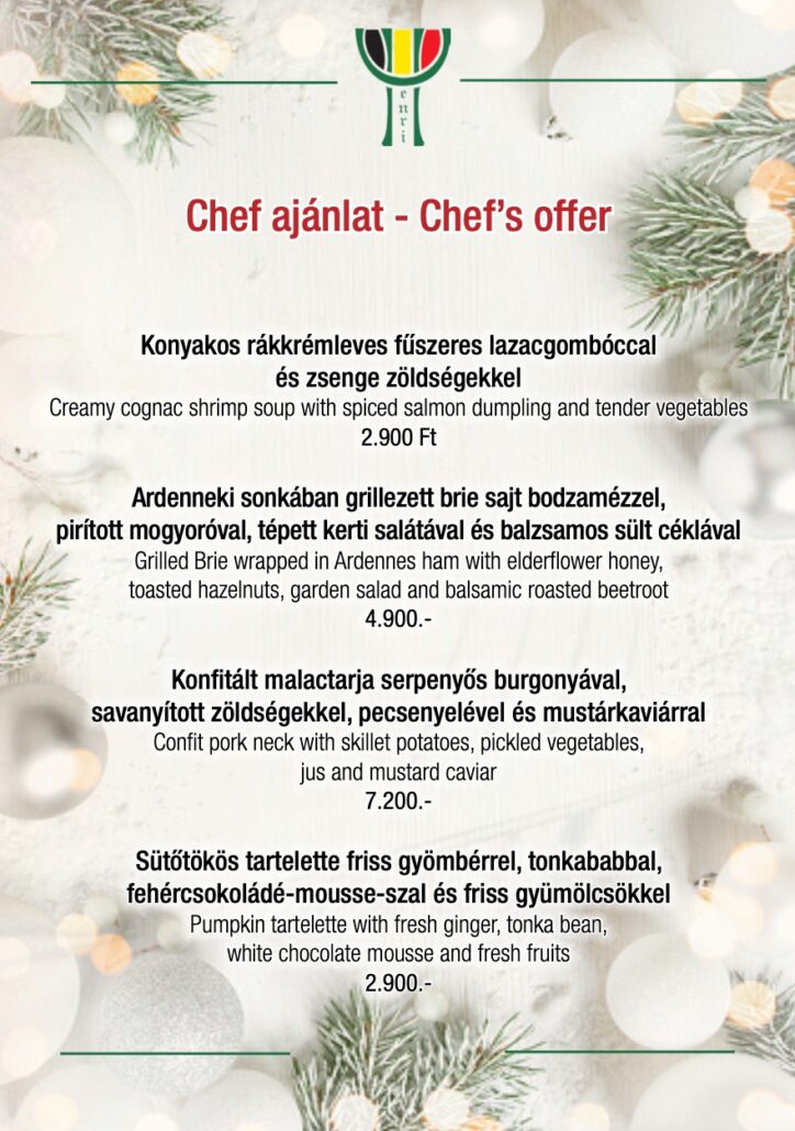 Some of our dishes also can be made lactose-free, please ask our waiters! Prices include VAT and are given in HUF. The invoice includes a 15% service charge.